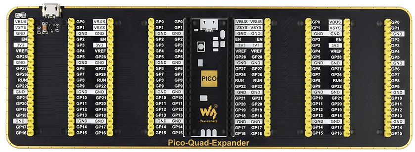 Quad GPIO Expander For Raspberry Pi Pico, Four Sets Of Male Headers For Connecting More Expansion Modules, USB Power Input Connector.