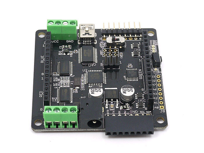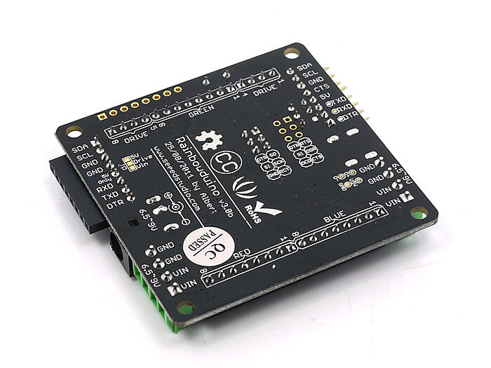The Rainbowduino board (V3.0) is an Arduino compatible controller board with professional multiplexed LED driver. It can drive a 8×8 RGB Led Matrix or a 4x4x4 RGB LED Cube in common Anode mode. Rainbowduino v3.0 uses two MY9221 chips which is a 12-channels (R/G/B x 4) constant current Adaptive Pulse Density Modulation(APDM). Rainbowduino v3.0 has provisions for cascading more such boards with I2C interface.