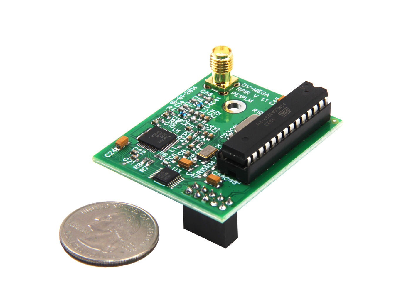 The DVMEGA-UHF transceiver board utilizes the chip ADF7021. This IC constitutes a complete transceiver for digital data with GMSK modulation. The control of the transceiver chip is handled with a local ATMEGA 328 on the same board. The result is a flexible digital transceiver component with low power for the frequency range from 430 to 450 MHz. The DVMEGA-UHF board handles the radio side and the modulation/demodulation part, the Raspberry Pi is used for the protocol handling of DMR (and future digital modes).