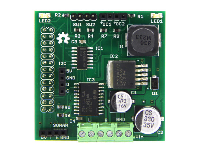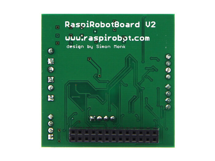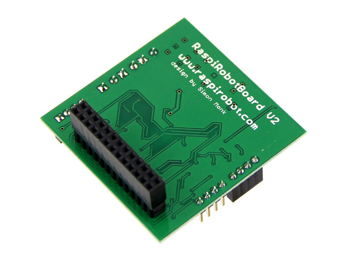 The RaspiRobot Board v2 is a motor interface board for the Raspberry Pi that includes a switched-mode power supply that will supply power to your Raspberry Pi from a variety of battery packs.