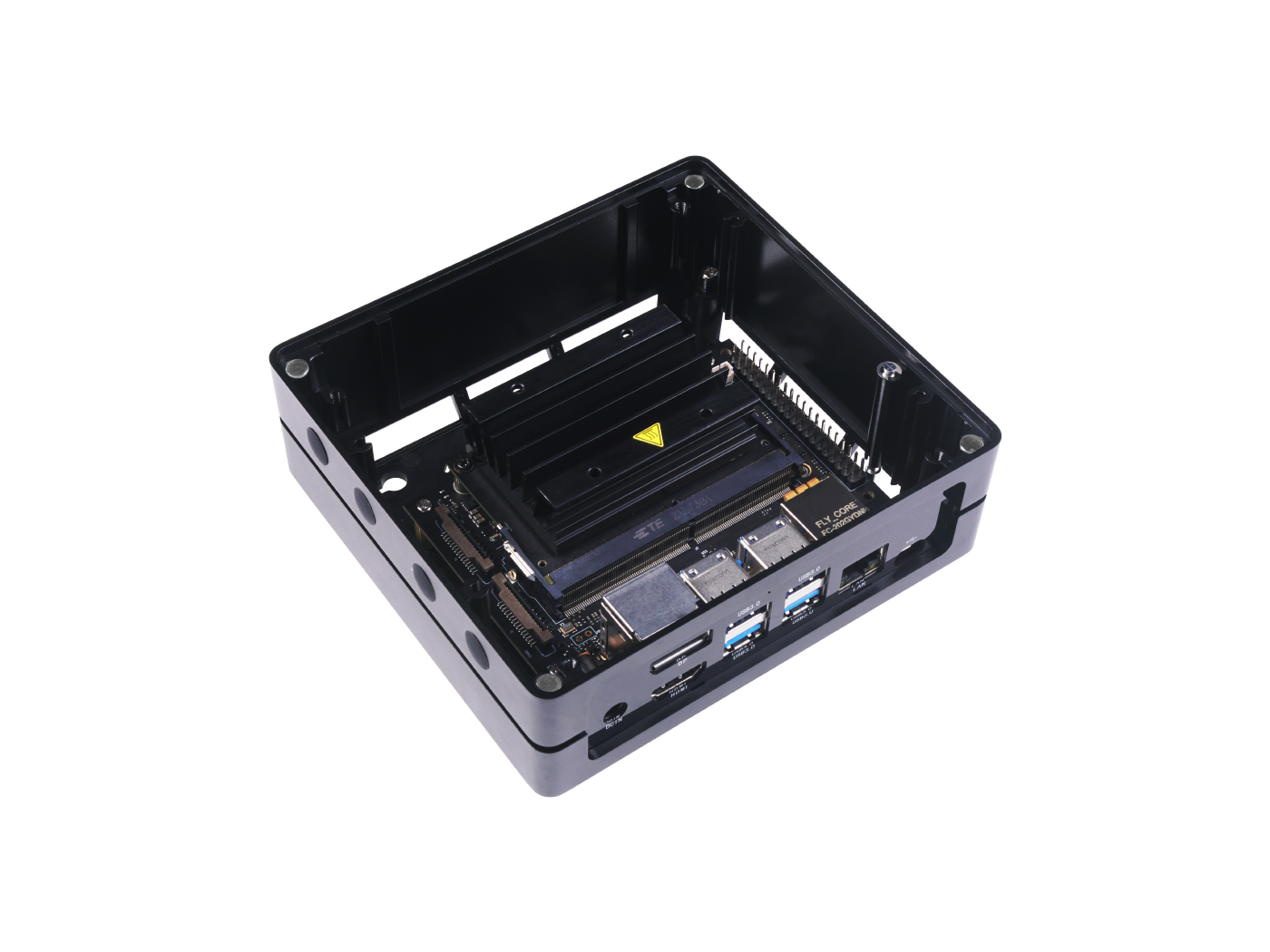 A hand-sized edge AI box with 0.5 TFLOPs of power, built with the NVIDIA Jetson Nano 4GB production module. It features a rich set of IOs, an aluminum case, a passive heatsink, pre-built Jetpack 4.6.1, onboard 16 GB eMMC, 2x SCI, 4x USB 3, M.2 Key M, HDMI, and DP.