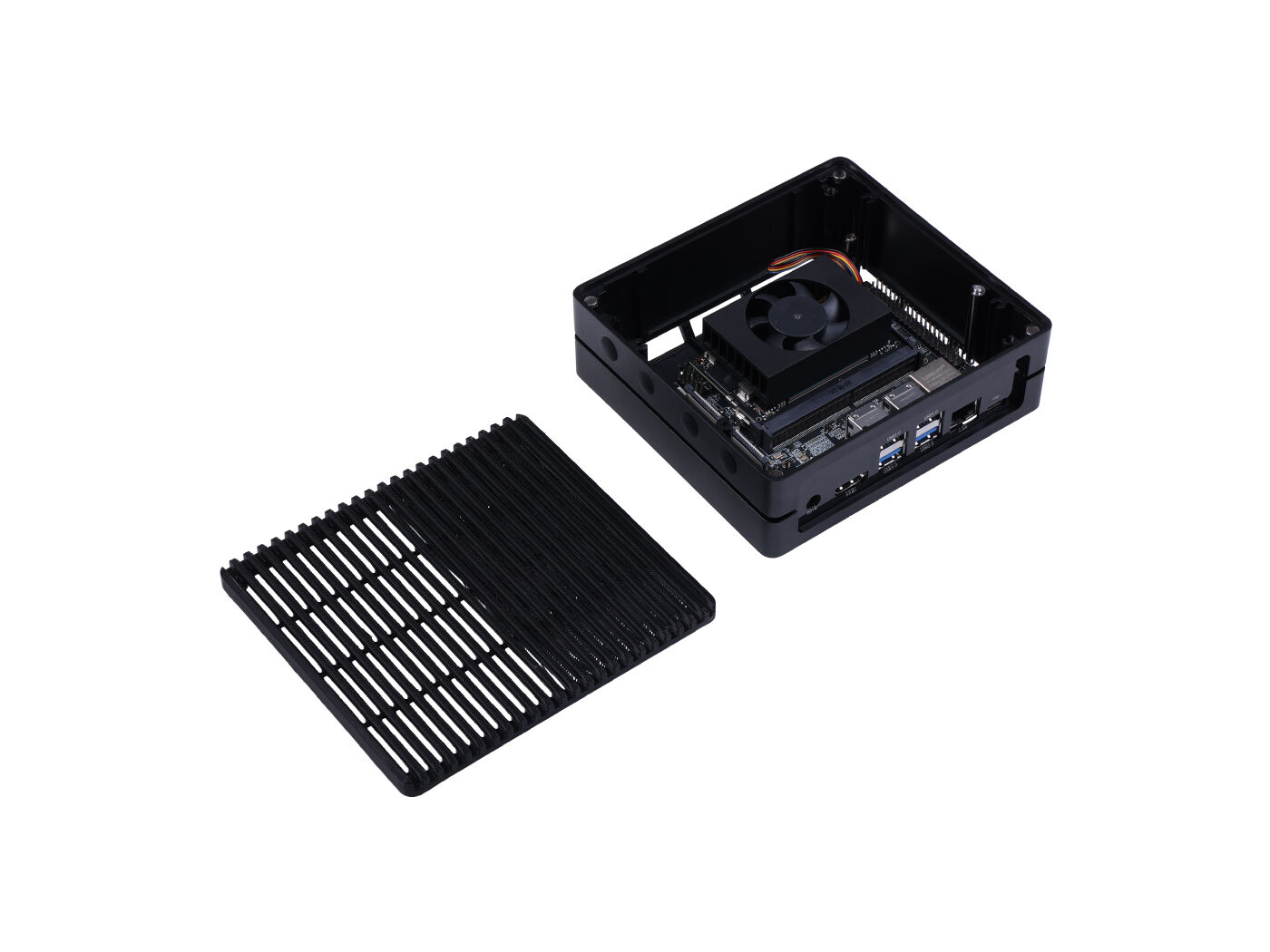 • Hand-size edge AI device: compact size at 130mm x120mm x 58.5mm, includes NVIDIA Jetson Orin™ NX production module, a heatsink, enclosure, and a power adapter. Support desktop, wall mount, fit in anywhere