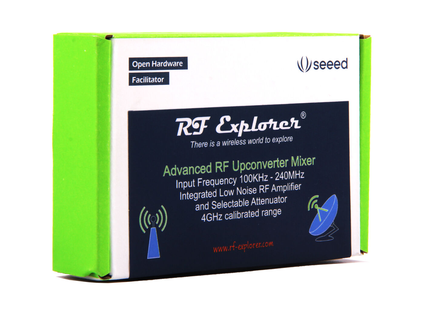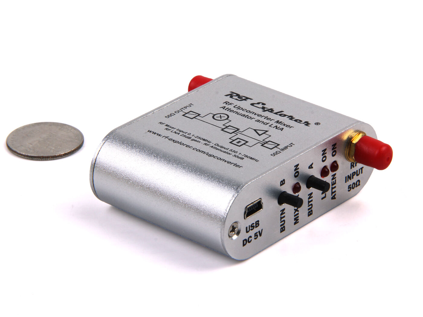 RF Explorer Upconverter is a high-performance RF frequency mixer to enable input frequency ranges from 100KHz to 250MHz in RF Explorer Spectrum Analyzer and other devices such as SDR and wideband radios.