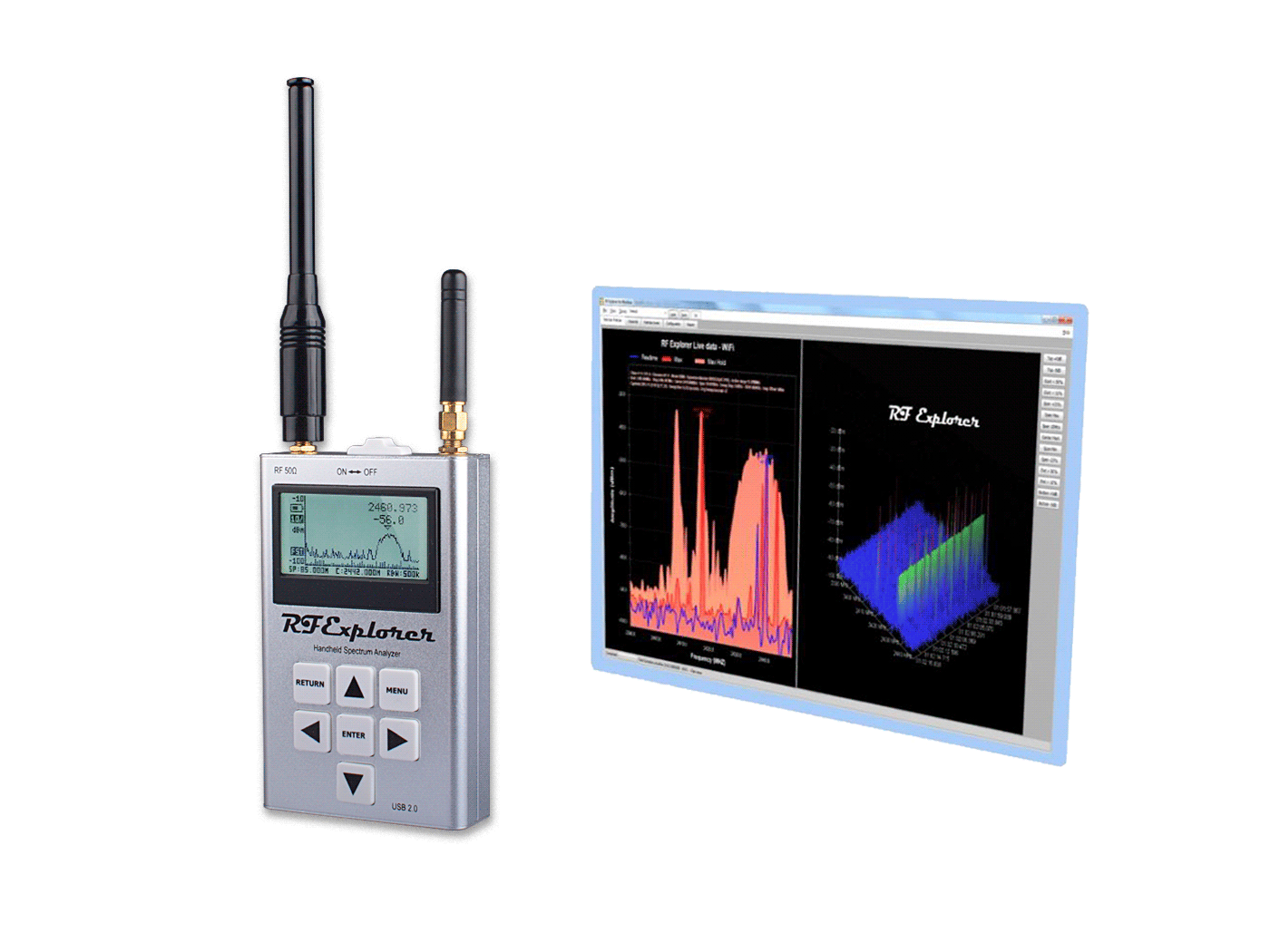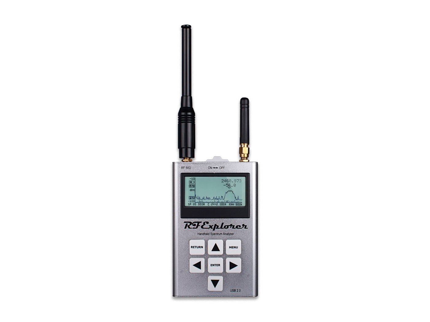 RF Explorer is a handheld digital spectrum analyzer, a very affordable tool for work in all popular frequency bands. It is based on a highly integrated frequency synthesizer and double balanced mixer which offers high performance, compact size, low consumption and low cost.
