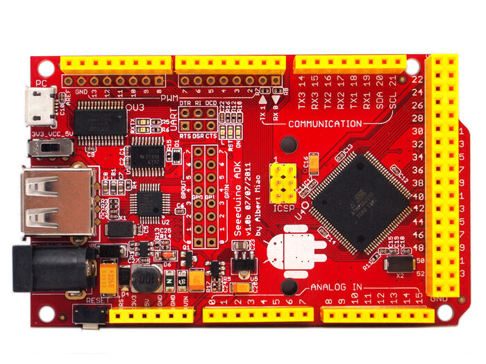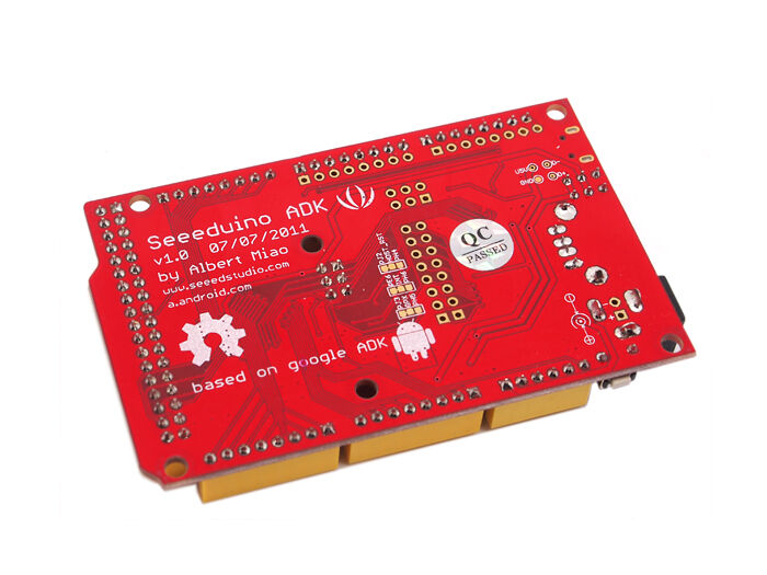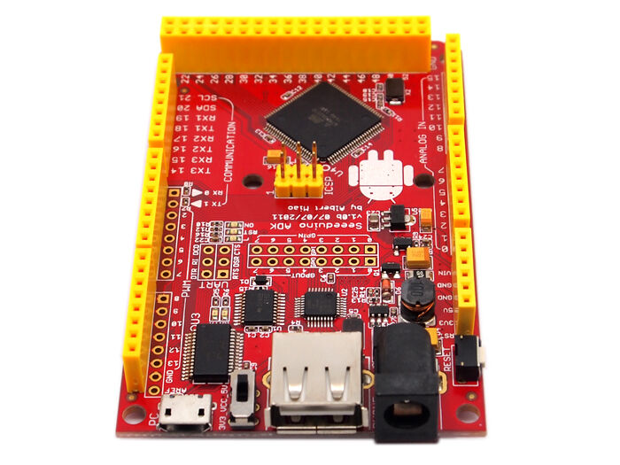 Seeeduino ADK Main Board is based on Android Open Accessory Development Kit(ADK). Compared to the Google's ADK Reference design, Seeeduino ADK has many added features like support of both 5V and 3.3V I/O (logic with a switch), smaller form-factor, better placement of reset button, pads for more pin-headers and sparkling RED PCB with Golden finish. Using ADK Main Board build your own Mobile accessories. Open Source Android development platform and Seeeduino ADK Main Board is an ideal solution for mobile based Home Automation.
