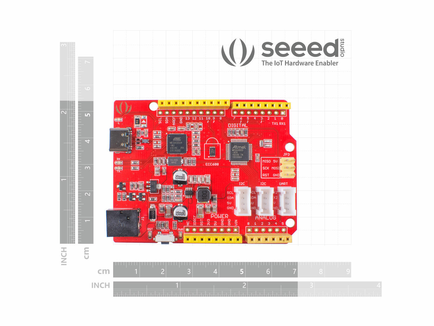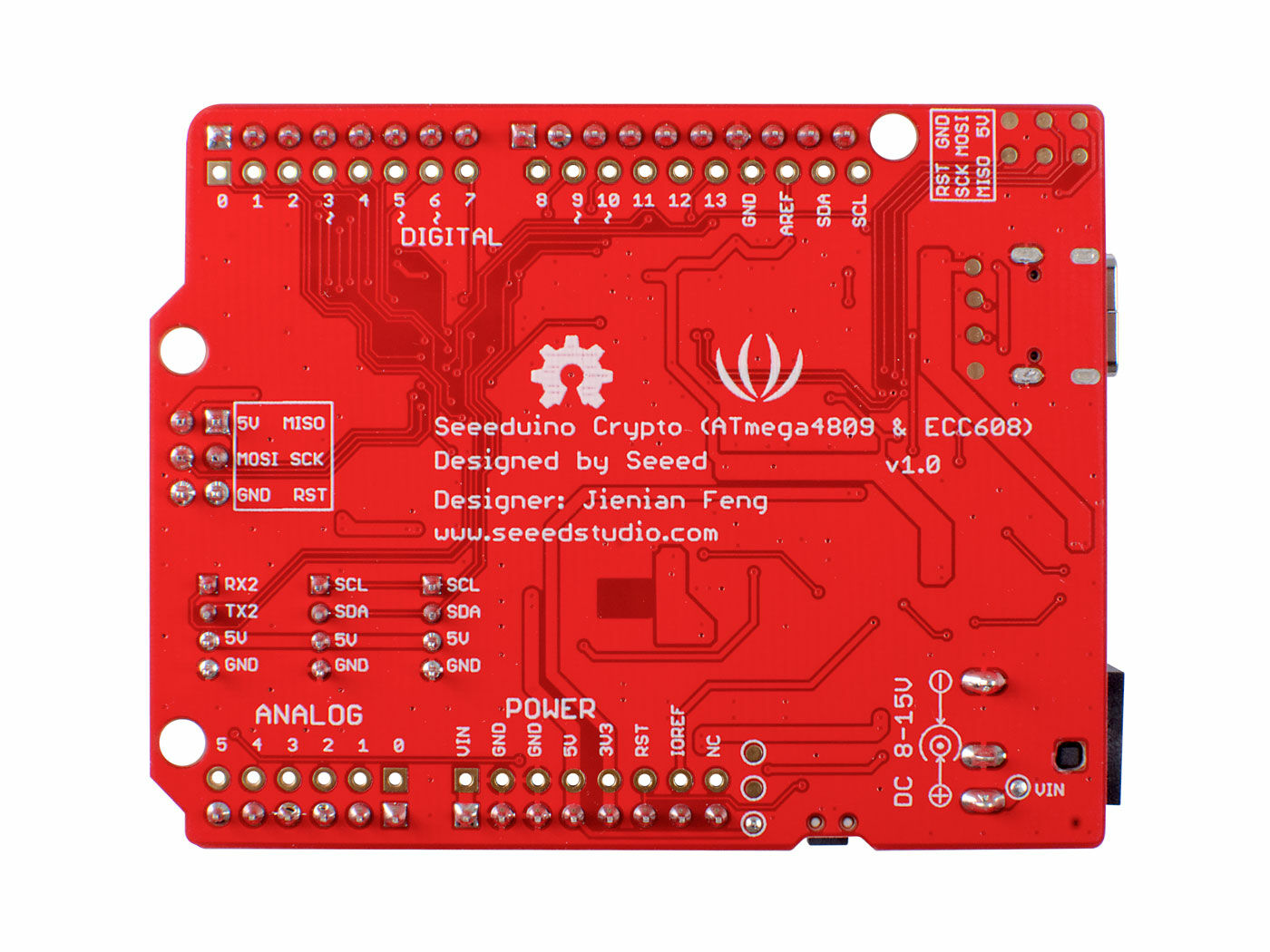 Along with the encryption, Seeeduino Crypto is functionally the same as the Seeeduino V4.2 / Arduino Uno Rev3. It has wealth interface resources, including 6 analog input pins, 14 digital I/O – 5 of which can work as PWM output, not to mention, as part of the Seeeduino family Seeeduino Crypto comes with 2 Grove I2C port and 1 Grove UART Port. Now the whole Grove system is yours, you can play with hundreds of sensors and actuators simply by plugging.