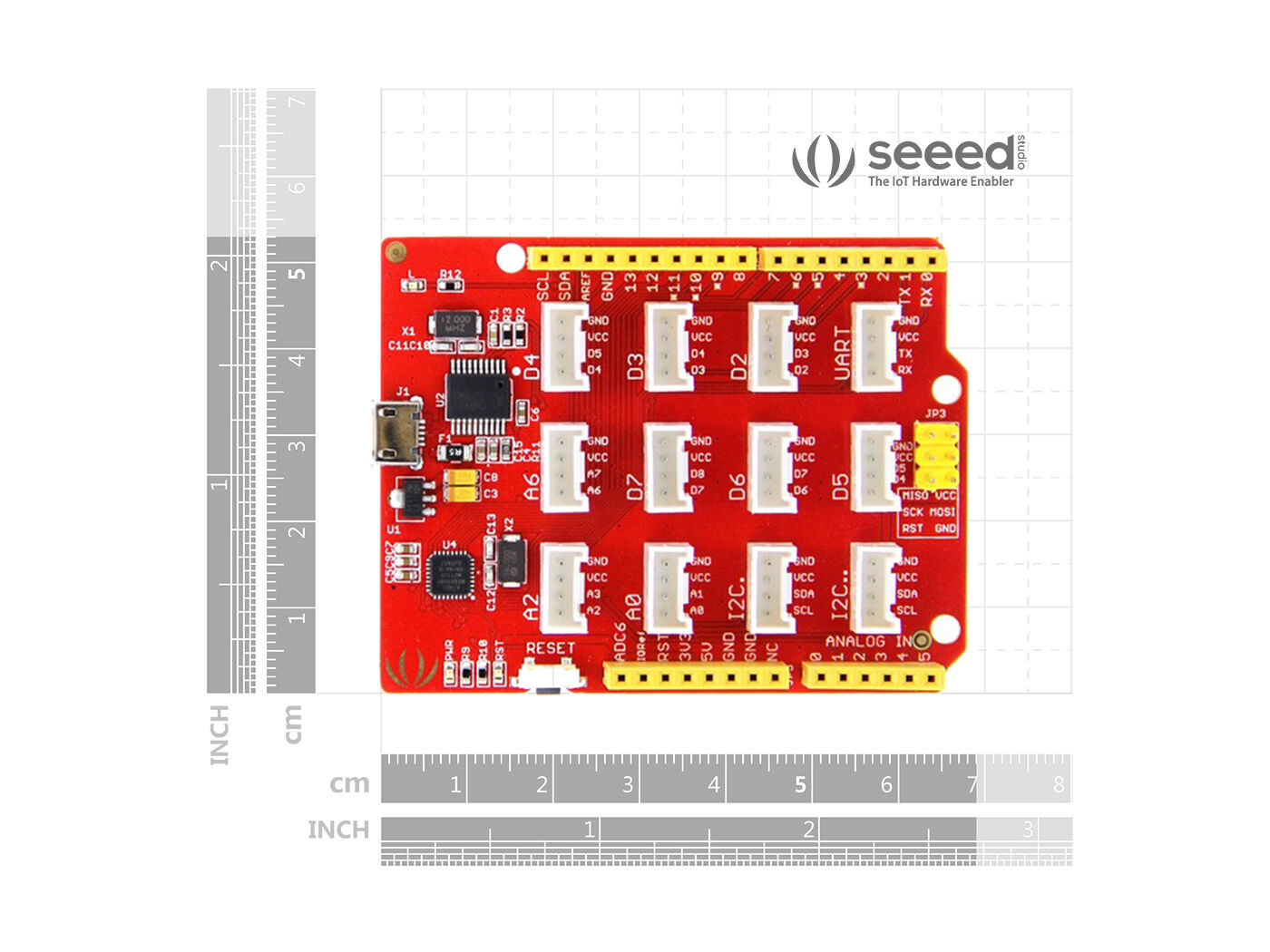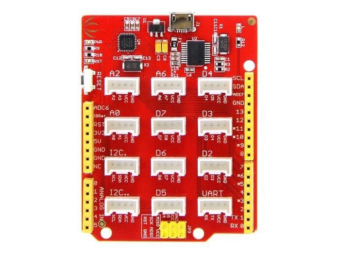 Seeeduino Lotus is an ATmega328 Microcontroller development board. It is a combination of Seeeduino and Base Shield. It uses Atmel ATMEGA328P-MU and CH340. ATMEGA328P-MU is a high performance, low power 8-Bit AVR Microcontroller. CH340 is an USB bus converter chip that can realize an USB to serial interface. Seeeduino Lotus has 14 digital input/output (6 of which can output PWM) and 7 analog input/output, a micro USB connection, an ICSP header, 12 Grove connections, a reset button.