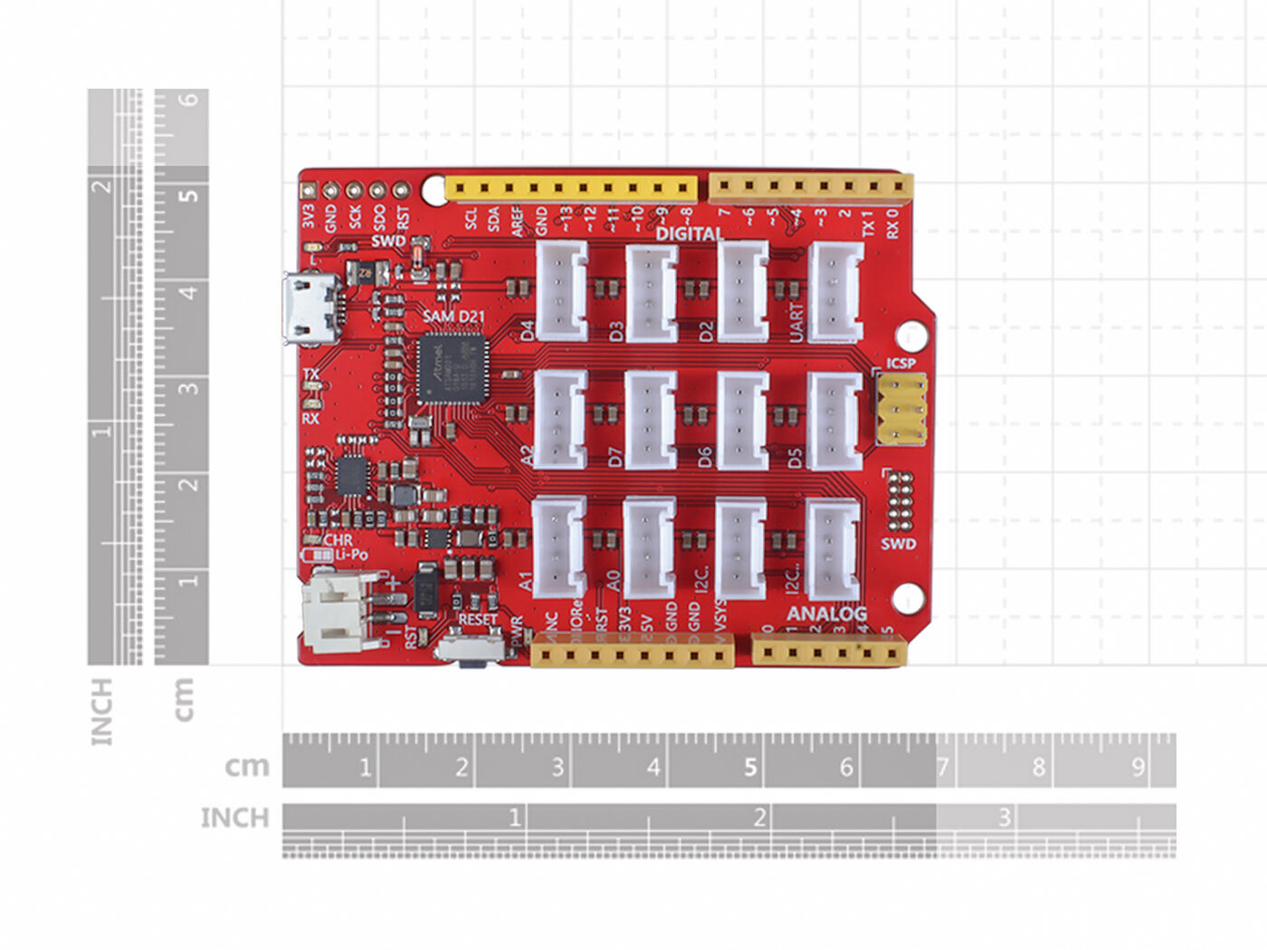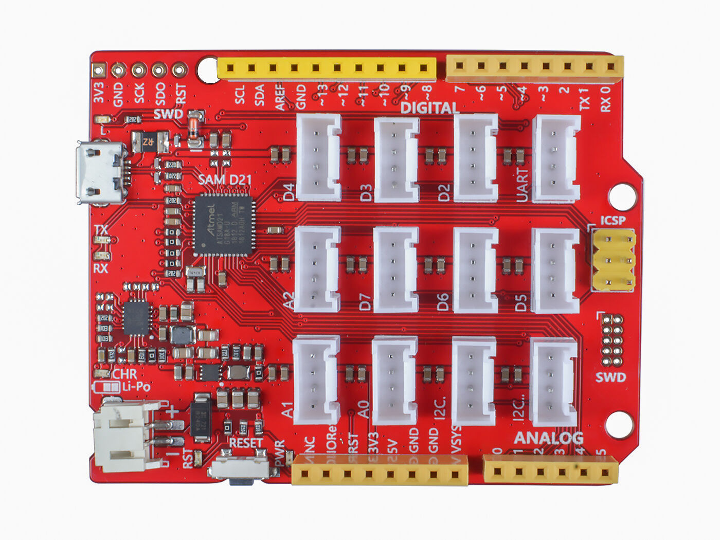 Seeeduino Lotus Cortex-M0+ has 14 digital input/outputs (10 of which support PWM) and 6 analog input/outputs, 3 Serial Communication Interface, a micro USB connector, a JST2.0 Li-Po connector, an ICSP header, 12 Grove connectors, a reset button.