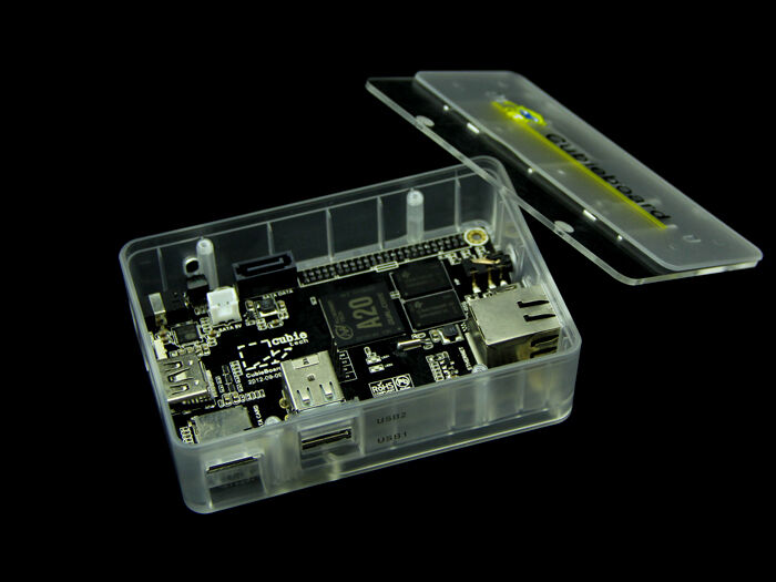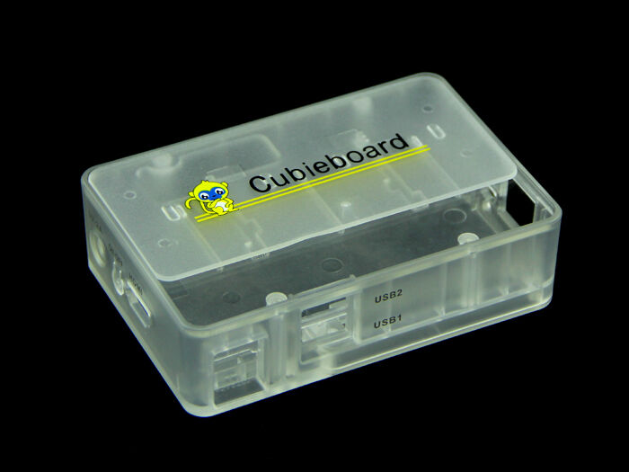 This is a molded enclosure for Cubieboard that has frosted plates. It fits perfectly for Cubieboard by routing out all ports seamlessly and having marks aside. The top plate slides open so that you can use the SATA power and data sockets.