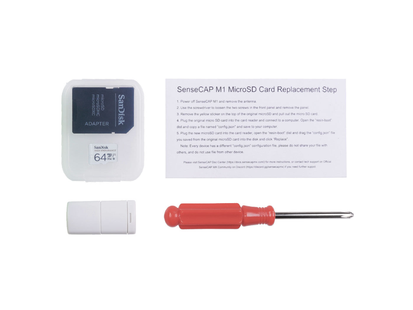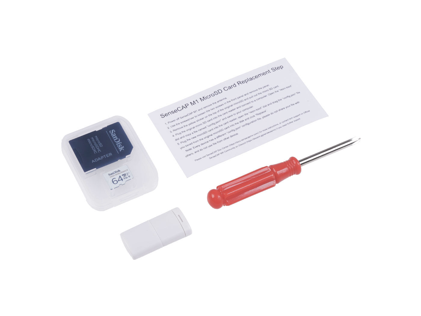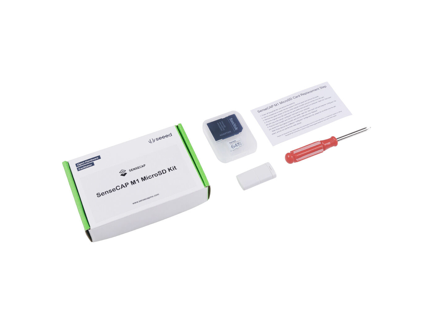 The kit comes with a 64GB MicroSD card with burned SenseCAP M1 Image, a screwdriver, and a MicroSD card reader. Users could easily replace their SenseCAP MicroSD card using SenseCAP M1 MicroSD kits.
