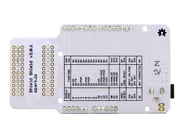 IMPORTANT: The Shield Shield does not map the Spark Core pins to like-numbered pins on the Arduino. In other words, D0 on the Spark Core is not the same as D0 on the Arduino. Please review the pin mapping table to the right and plan accordingly.
