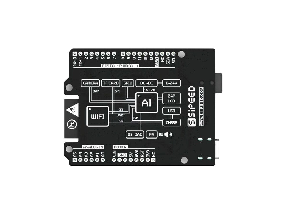 Based on MAIX Module, the Maixduino is a RISC-V 64 development board for AI + IoT applications. Different with other Sipeed MAIX dev. boards, Maixduino was designed in an Arduino Uno form factor, with ESP32 module on board together with MAIX AI module.