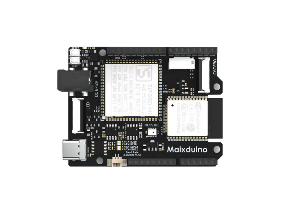 Based on MAIX Module, the Maixduino is a RISC-V 64 development board for AI + IoT applications. Different with other Sipeed MAIX dev. boards, Maixduino was designed in an Arduino Uno form factor, with ESP32 module on board together with MAIX AI module.
