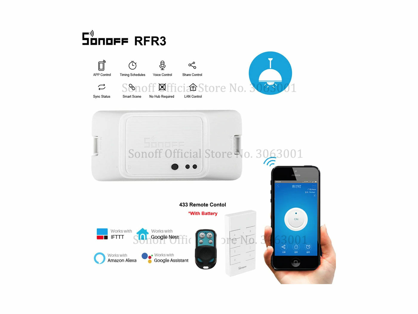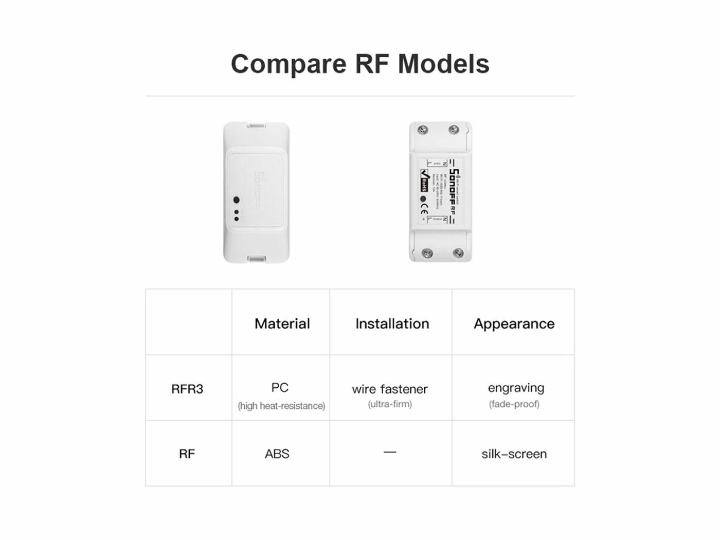 | RFR3 | 1 Channel 433 RF Wireless Switch,DIY mode | 90~250VAC | 10A | 2200W | 2.4Ghz, 433MHz RF |