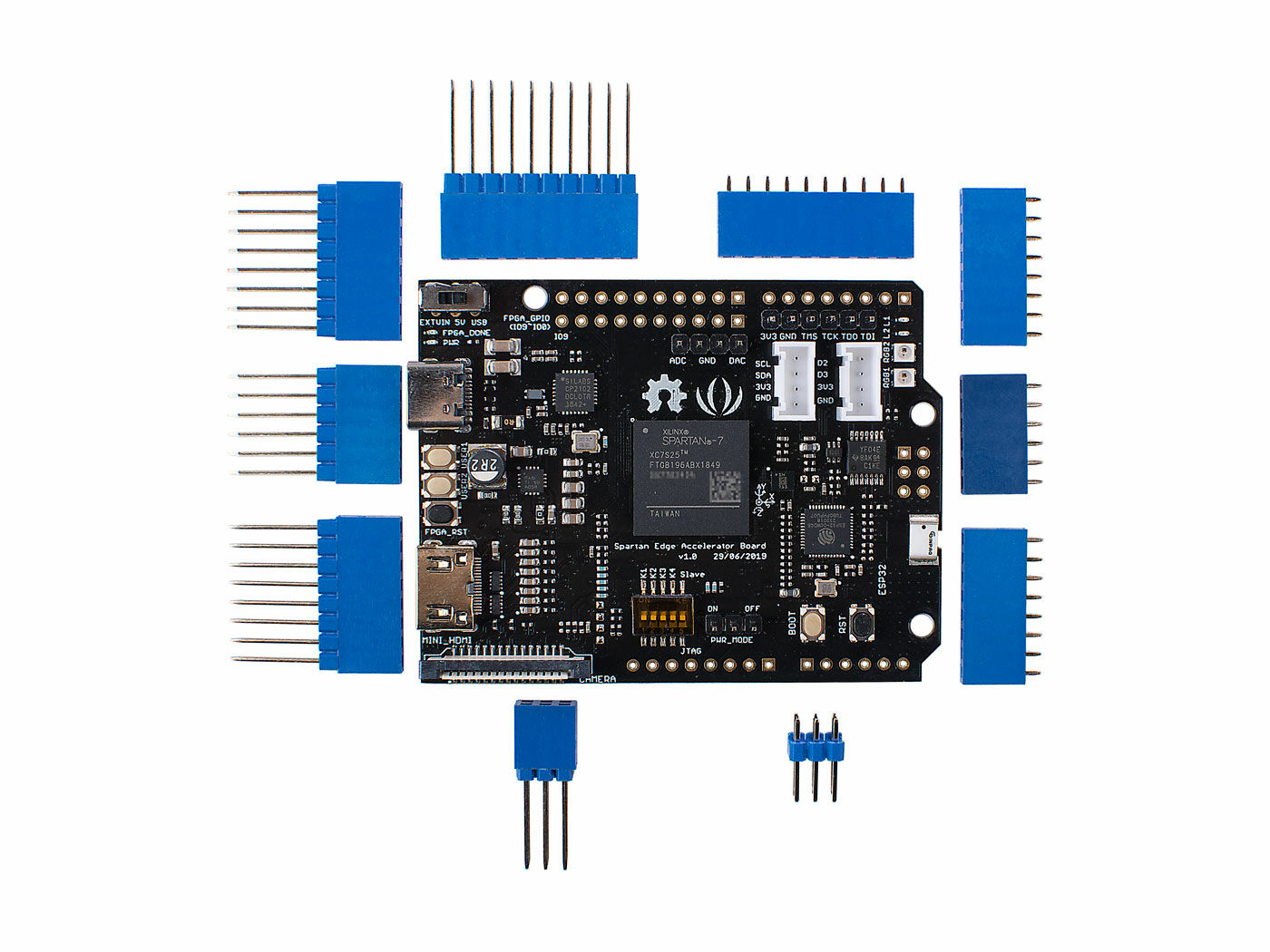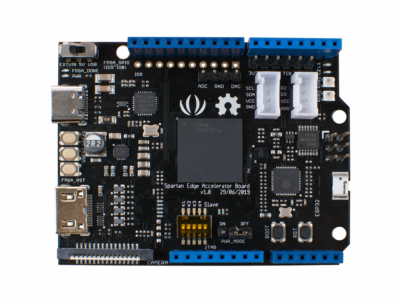 Spartan Edge Accelerator Board is a Xilinx Spartan FPGA development board in the Arduino UNO shield form factor. It can work with Arduino as an FPGA shield and as a stand-alone FPGA development board. With the onboard ESP32 chip, the Spartan Edge Accelerator Board also features 2.4GHz WiFi and Bluetooth 4.1. Moreover, this development board has a wealth of peripherals and interfaces which are extremely playable. Such as an 8-bit ADC, a 6-axis accelerometer, two RGB LEDs, a MINI HDMI interface, a CSI camera interface, two Grove interfaces, etc. All in all, it will be a perfect FPGA board for Makers and Hobbyists.