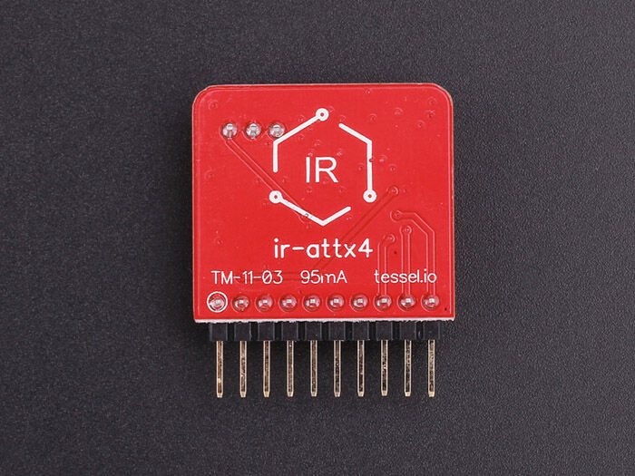 The Infrared (IR) Module can send and detect IR signals.Use a Tessel as a remote for your TV, radio, or even another Tessel. Transmits and receives from 30+ feet (line of sight) Detects max 38kHz IR Receiver IR LED