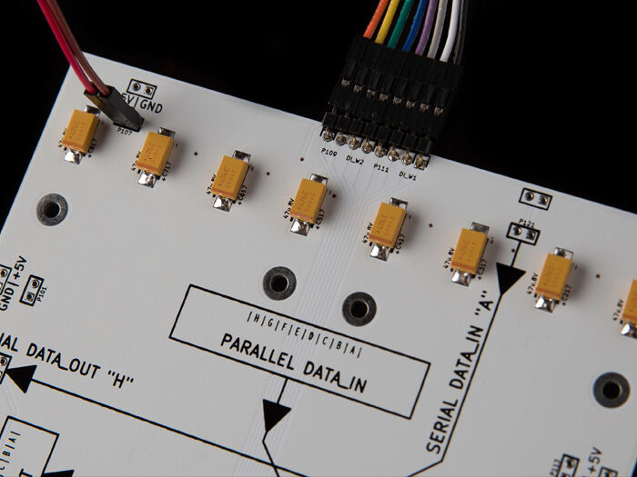 Control each board with 8 microcontroller pins (1 byte, Parallel mode, 8 rows of 16 RGB LEDs each) -