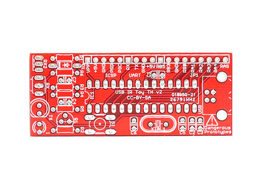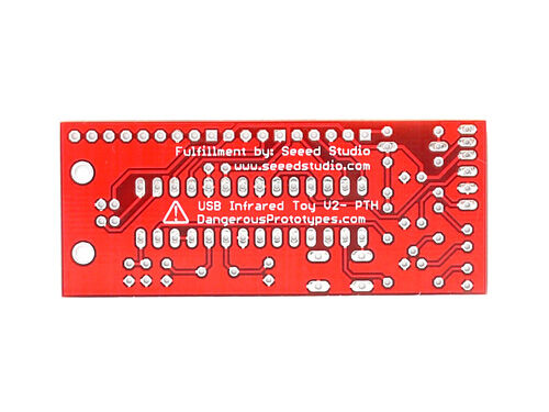 An all through-hole version of USB Infrared Toy receiver/transmitter. It's the same as the assembled surface-mount IR Toy, but with a couple additions: