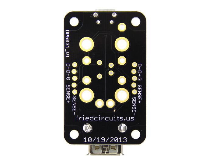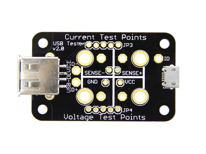 As part of the USB spec, you are limited to 500ma, so you want to monitor how close you are. Most people use USB hubs, both powered and unpowered, and with many devices connected, you can end up with less than 5V which can cause havoc on you projects. The USB Tester will make it a snap to monitor voltage levels and current usage without having to re-wire your breadboard. Just connect to your oscilloscope or DMM test leads, and you’re good to go! The USB Tester has both banana clip sized drills and standard 0.1” headers. When you are not testing current you can add a jumper for normal operation. The USB D+/D- pins are also broken out so you can monitor those on an oscilloscope, or for USB sniffing.