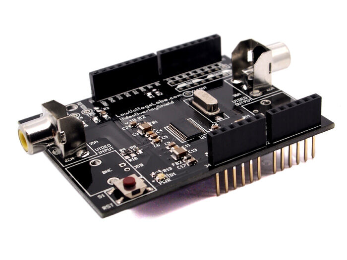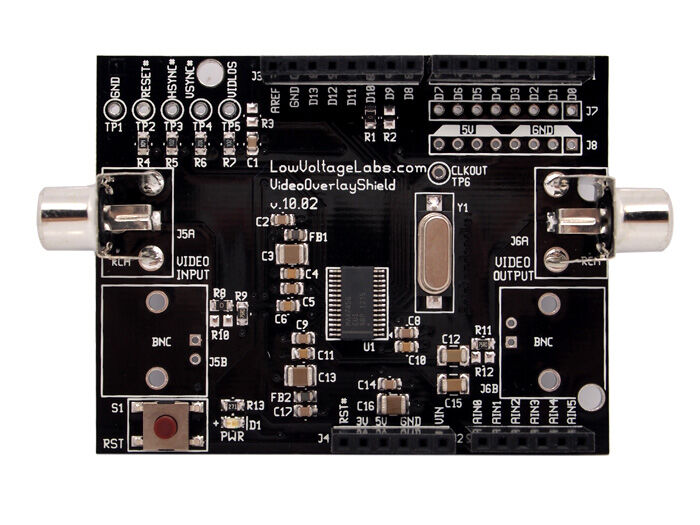The Arduino compatible shield board overlays text on analog video, using the Maxim MAX7456 on-screen display chip. This board allows easy overlay of text onto an analog video signal, NTSC or PAL. Connect this board to your favorite Arduino processor board to get started.