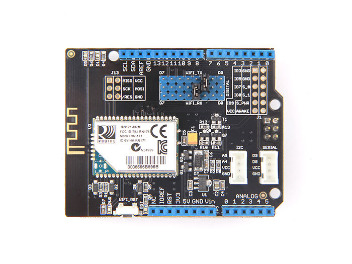 Featured with RN171 TCP/IP module, the WiFi shield allows your Arduino/Seeeduino to connect wireless networks up to 802.11b/g. The RN171 module supports TCP, UDP, FTP and HTTP communication protocols, which meet the needs of most wireless and Internet of Things (IoT) network projects, such as smart home networks, robots controls and personal weather stations.