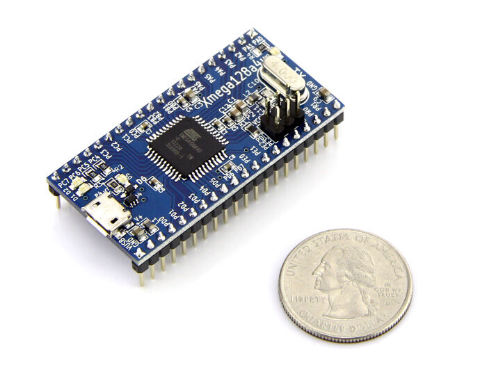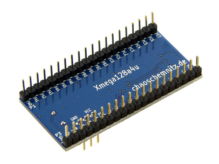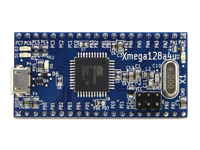 This board carries an Atmel ATXMega128A4U microcontroller. It fits directly on most breadboards. Load your firmware via PDI or with the preinstalled original Atmel USB-DFU-Loader (Flip).