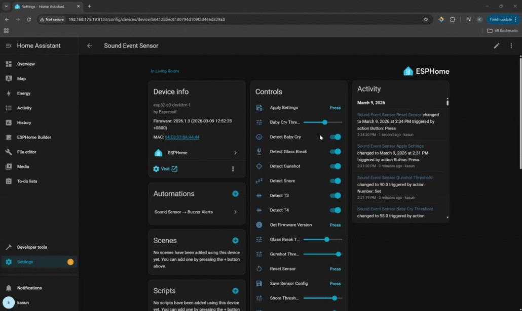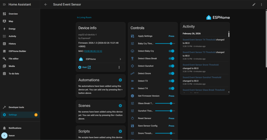 AI modelinin yerel olarak çalıştırılması, sistemin farklı ses olaylarını yüksek güvenilirlikle ayırt etmesini sağlarken yanlış alarmları en aza indirir. Bu, otomasyon senaryolarında tutarlı doğruluğun, bir sistemin gerçek ortamlarda gerçekten kullanılabilir olup olmadığını belirlemesi açısından hayati önem taşır.