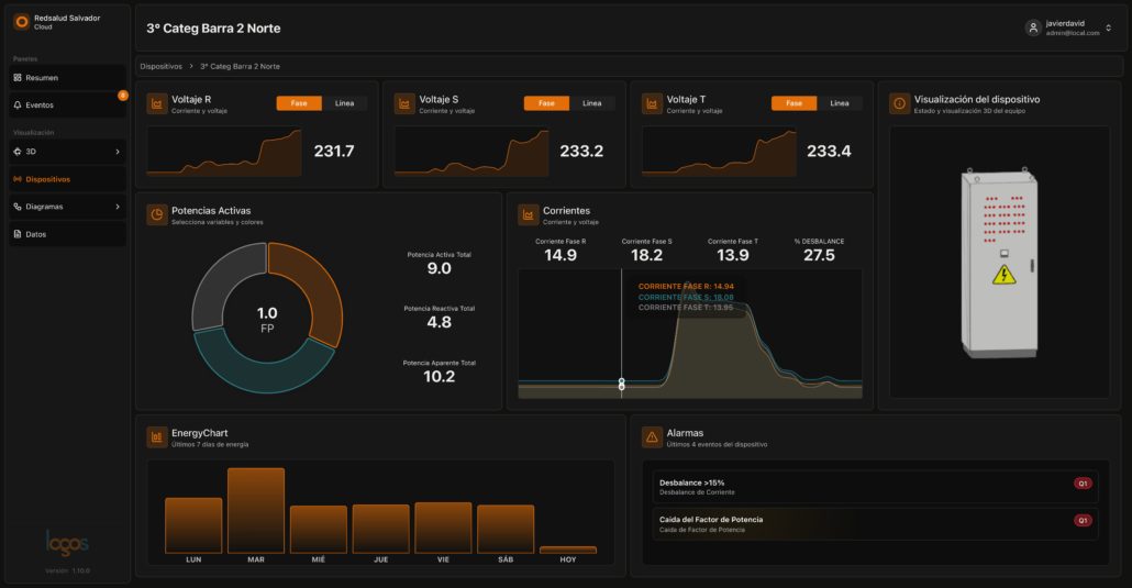 LogOS’un her kullanıcıya yönelik özelliği, operatörlerin gerçekten ihtiyaç duyduğu şeyler etrafında inşa edilmiştir: alt saniye yenileme süresine sahip canlı bir gösterge paneli, WhatsApp ve Telegram üzerinden iletilen akıllı uyarılar, otomatik enerji raporları, elektrik tesisatının etkileşimli tek hat diyagramları ve uzman olmayan personelin tesisin sağlığını sezgisel bir şekilde görmesini sağlayan 3D Dijital İkiz.